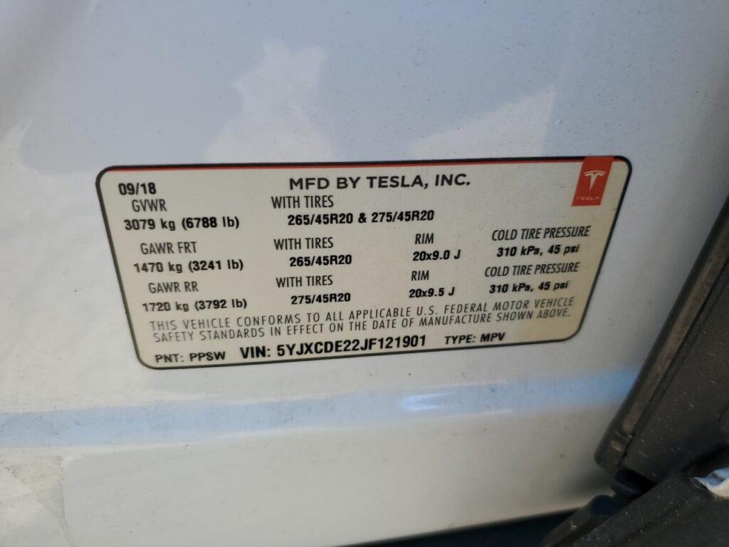 This 2018 Tesla Model X (White) comes from a major insurance auction in the USA or Canada. All information on this page is linked to the vehicle’s VIN (5YJXCDE22JF121901), which helps confirm where the car was listed and what condition it was in at the time of sale.