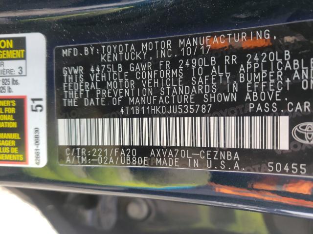This 2018 Toyota Camry (Black) comes from a major insurance auction in the USA or Canada. All information on this page is linked to the vehicle’s VIN (4T1B11HK0JU535787), which helps confirm where the car was listed and what condition it was in at the time of sale.