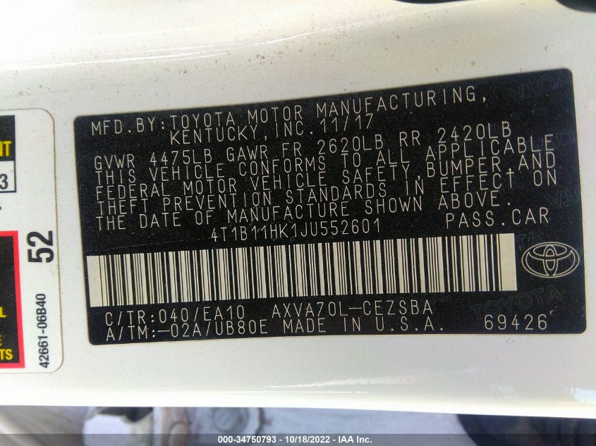 This 2018 Toyota Camry (White) comes from a major insurance auction in the USA or Canada. All information on this page is linked to the vehicle’s VIN (4T1B11HK1JU552601), which helps confirm where the car was listed and what condition it was in at the time of sale.