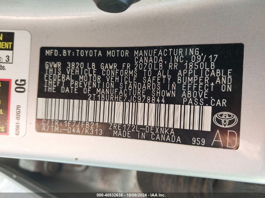 This 2018 TOYOTA COROLLA (Unknown Color) comes from a major insurance auction in the USA or Canada. All information on this page is linked to the vehicle’s VIN (2T1BURHE7JC978844), which helps confirm where the car was listed and what condition it was in at the time of sale.