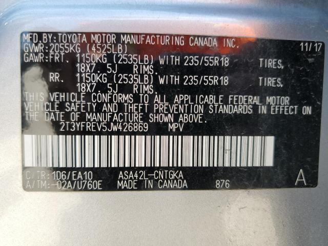 This 2018 Toyota RAV4 (Silver) comes from a major insurance auction in the USA or Canada. All information on this page is linked to the vehicle’s VIN (2T3YFREV5JW426869), which helps confirm where the car was listed and what condition it was in at the time of sale.