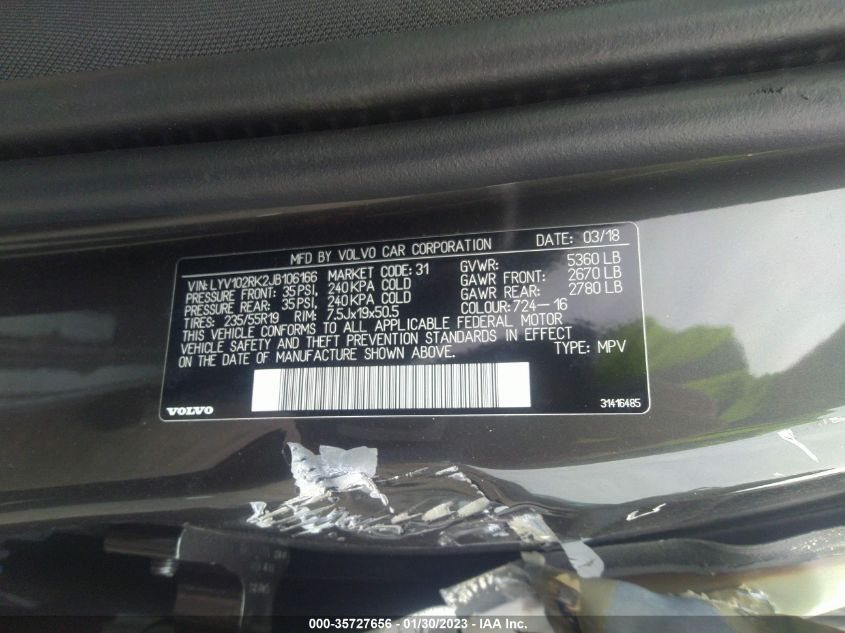 This 2018 Volvo XC60 (Grey) comes from a major insurance auction in the USA or Canada. All information on this page is linked to the vehicle’s VIN (LYV102RK2JB106166), which helps confirm where the car was listed and what condition it was in at the time of sale.