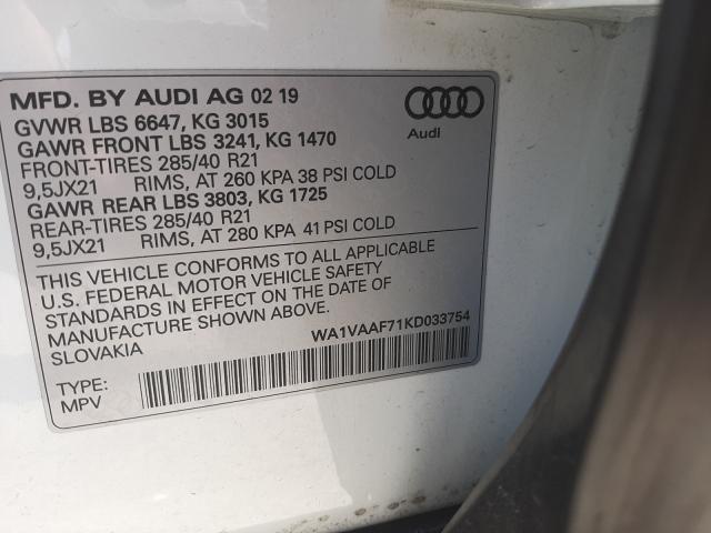 This 2019 AUDI Q7 PRESTIG (WHITE) comes from a major insurance auction in the USA or Canada. All information on this page is linked to the vehicle’s VIN (WA1VAAF71KD033754), which helps confirm where the car was listed and what condition it was in at the time of sale.
