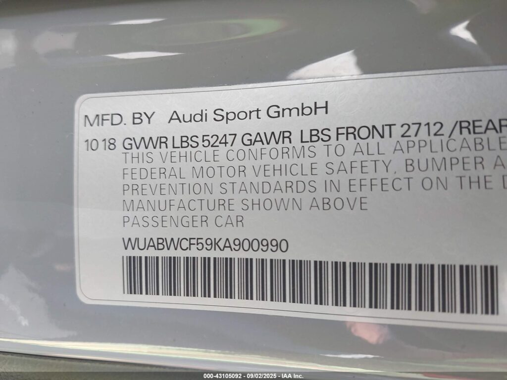 This 2019 Audi RS5 (Grey) comes from a major insurance auction in the USA or Canada. All information on this page is linked to the vehicle’s VIN (WUABWCF59KA900990), which helps confirm where the car was listed and what condition it was in at the time of sale.