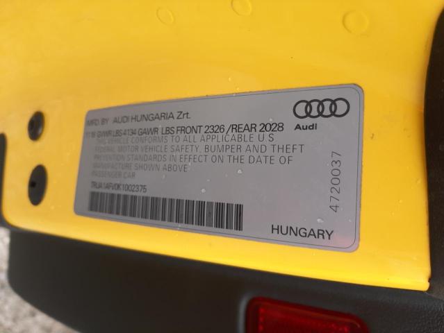 This 2019 Audi TTS (Yellow) comes from a major insurance auction in the USA or Canada. All information on this page is linked to the vehicle’s VIN (TRUA1AFV0K1002375), which helps confirm where the car was listed and what condition it was in at the time of sale.