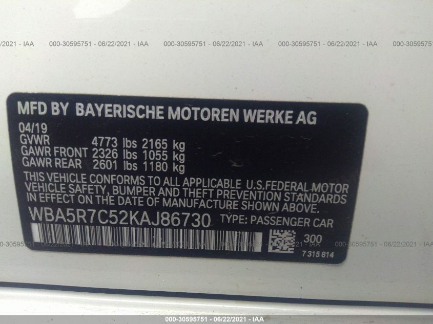 | VIN Number | WBA5R7C52KAJ86730 |