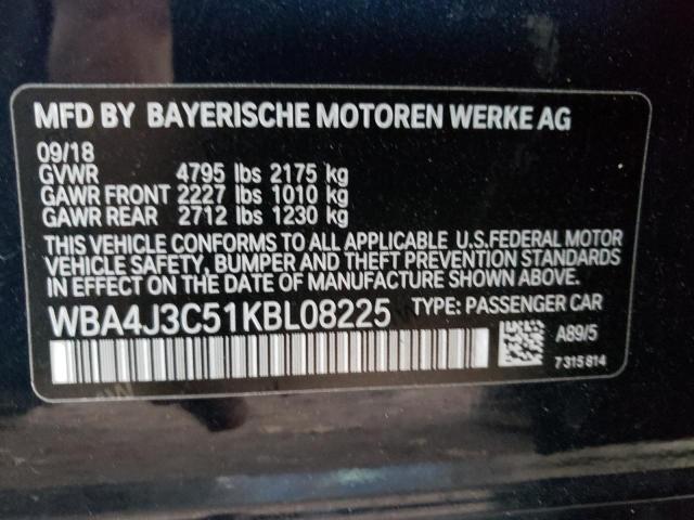 This 2019 BMW 4 Series (Blue) comes from a major insurance auction in the USA or Canada. All information on this page is linked to the vehicle’s VIN (WBA4J3C51KBL08225), which helps confirm where the car was listed and what condition it was in at the time of sale.