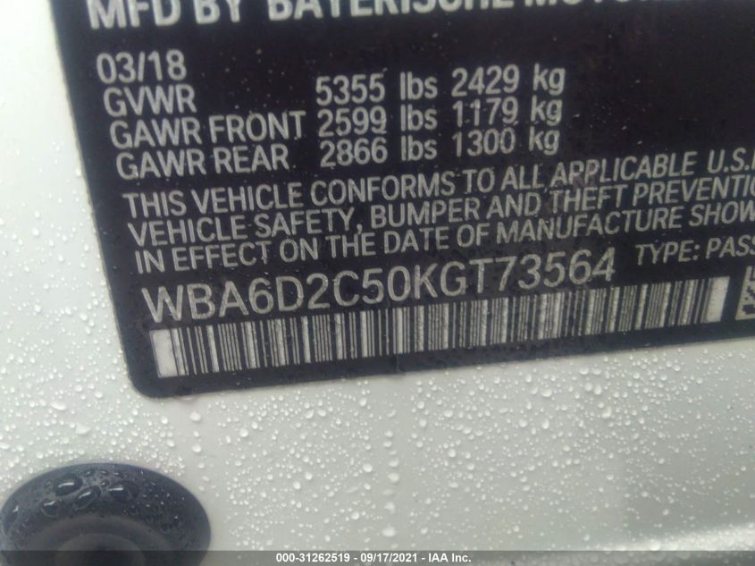 This 2019 BMW 6 Series (Other) comes from a major insurance auction in the USA or Canada. All information on this page is linked to the vehicle’s VIN (WBA6D2C50KGT73564), which helps confirm where the car was listed and what condition it was in at the time of sale.
