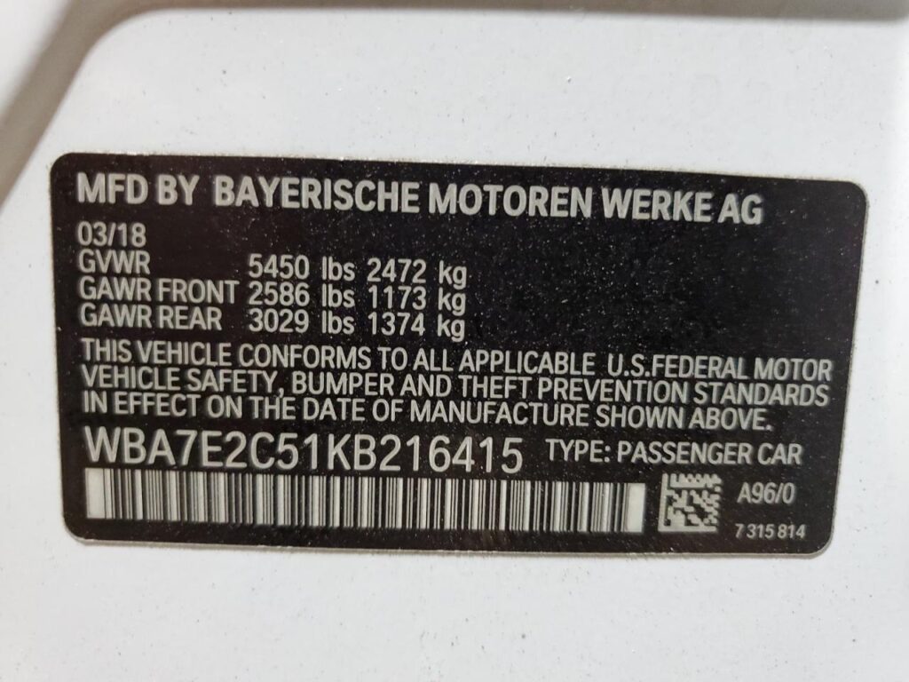 | VIN Number | WBA7E2C51KB216415 |