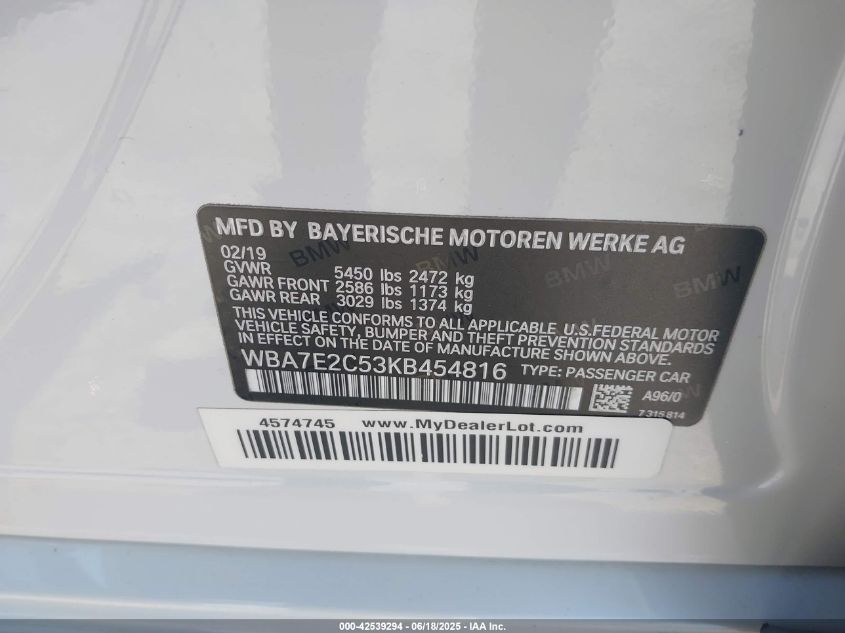 2019 BMW 740I – WBA7E2C53KB454816