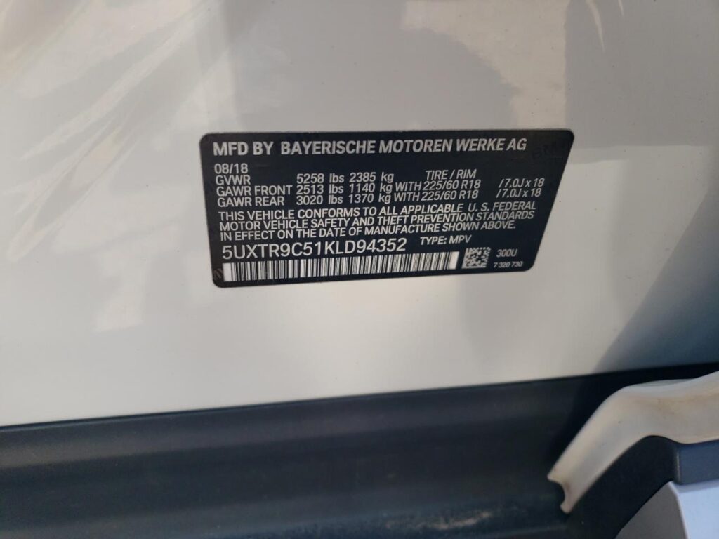 This 2019 BMW X3 (WHITE) comes from a major insurance auction in the USA or Canada. All information on this page is linked to the vehicle’s VIN (5UXTR9C51KLD94352), which helps confirm where the car was listed and what condition it was in at the time of sale.