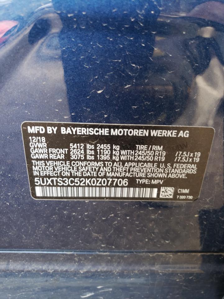 This 2019 BMW X3 (Blue) comes from a major insurance auction in the USA or Canada. All information on this page is linked to the vehicle’s VIN (5UXTS3C52K0Z07706), which helps confirm where the car was listed and what condition it was in at the time of sale.