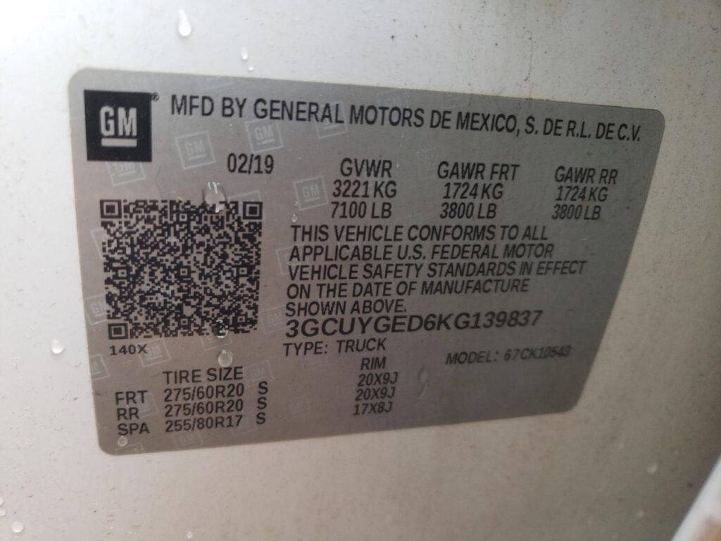 VIN: 3GCUYGED6KG139837