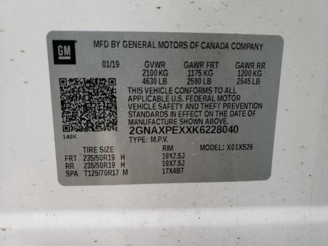 This 2019 Chevrolet Equinox (White) comes from a major insurance auction in the USA or Canada. All information on this page is linked to the vehicle’s VIN (2GNAXPEXXK6228040), which helps confirm where the car was listed and what condition it was in at the time of sale.