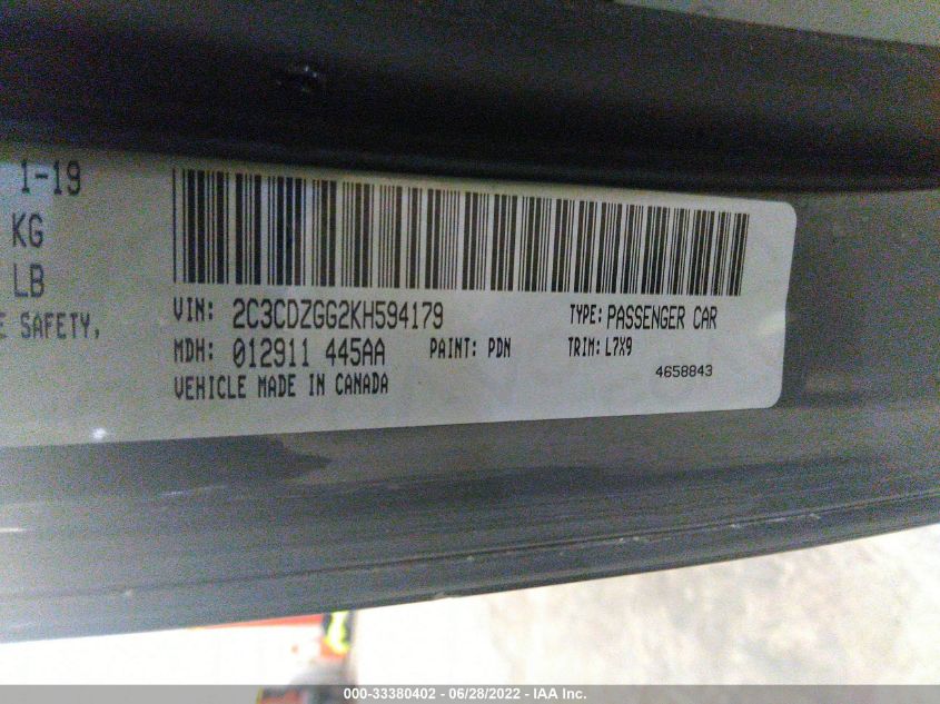 | VIN Number | 2C3CDZGG2KH594179 |