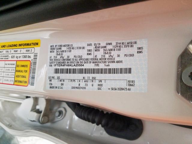 This 2019 Ford Ranger (White) comes from a major insurance auction in the USA or Canada. All information on this page is linked to the vehicle’s VIN (1FTER4FH6KLA25504), which helps confirm where the car was listed and what condition it was in at the time of sale.
