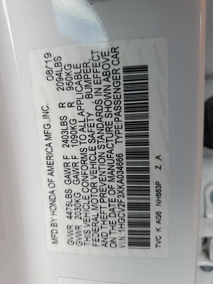 This 2019 HONDA ACCORD (WHITE) comes from a major insurance auction in the USA or Canada. All information on this page is linked to the vehicle’s VIN (1HGCV2F3XKA034666), which helps confirm where the car was listed and what condition it was in at the time of sale.