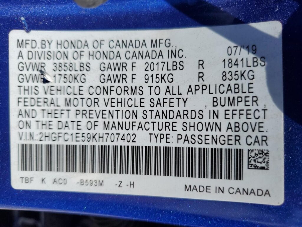 | VIN Number | 2HGFC1E59KH707402 |