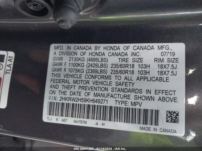 | VIN Number | 2HKRW2H59KH649271 |