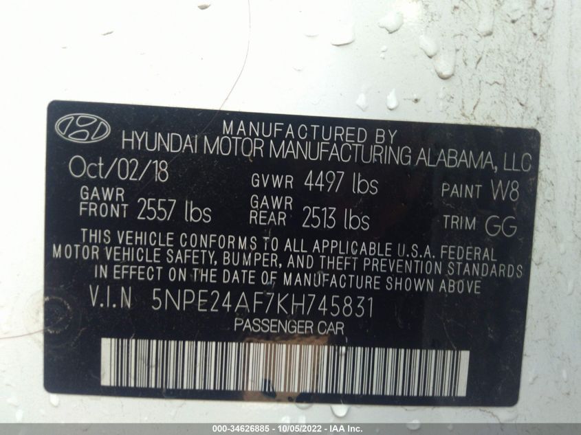 2019 Hyundai Sonata – 5NPE24AF7KH745831