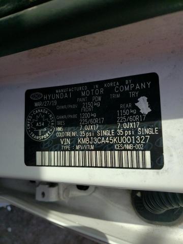 This 2019 Hyundai Tucson (White) comes from a major insurance auction in the USA or Canada. All information on this page is linked to the vehicle’s VIN (KM8J3CA45KU001327), which helps confirm where the car was listed and what condition it was in at the time of sale.