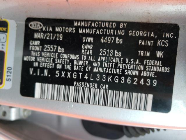 This 2019 Kia Optima (Silver) comes from a major insurance auction in the USA or Canada. All information on this page is linked to the vehicle’s VIN (5XXGT4L33KG362439), which helps confirm where the car was listed and what condition it was in at the time of sale.