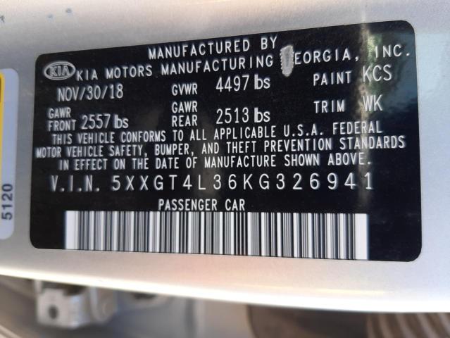 This 2019 Kia Optima (Silver) comes from a major insurance auction in the USA or Canada. All information on this page is linked to the vehicle’s VIN (5XXGT4L36KG326941), which helps confirm where the car was listed and what condition it was in at the time of sale.