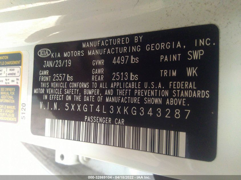 | VIN Number | 5XXGT4L3XKG343287 |