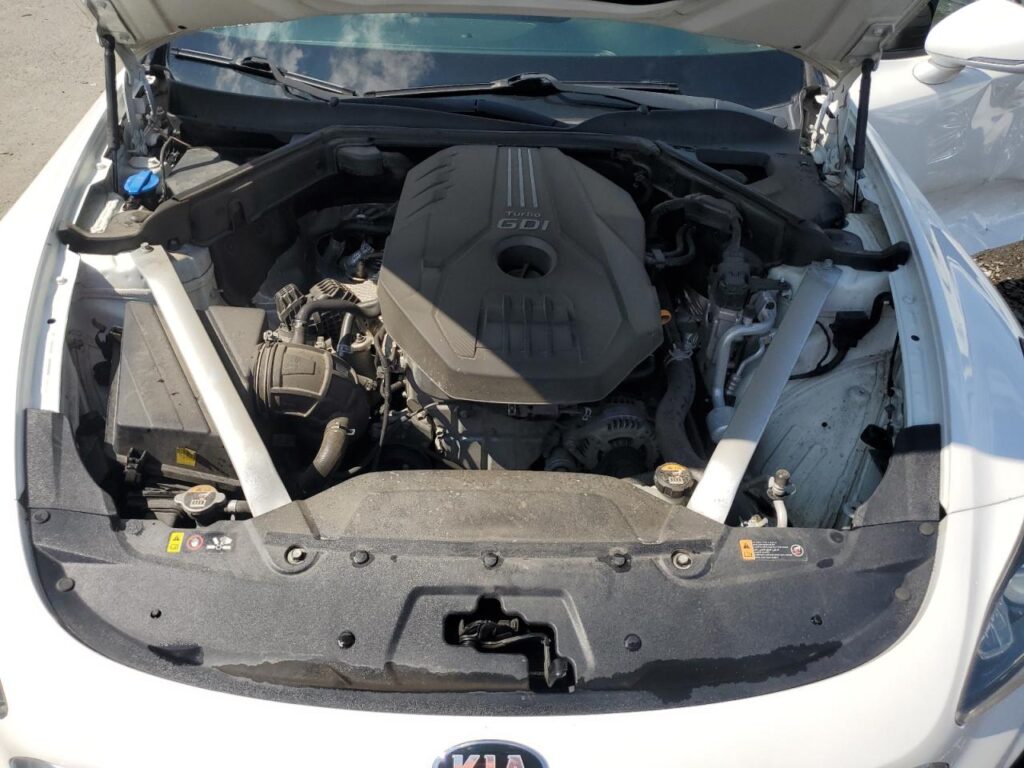 This 2019 Kia Stinger (White) is equipped with an engine designed to balance performance and efficiency. According to the auction listing, the vehicle had 66,348 miles at the time of sale.