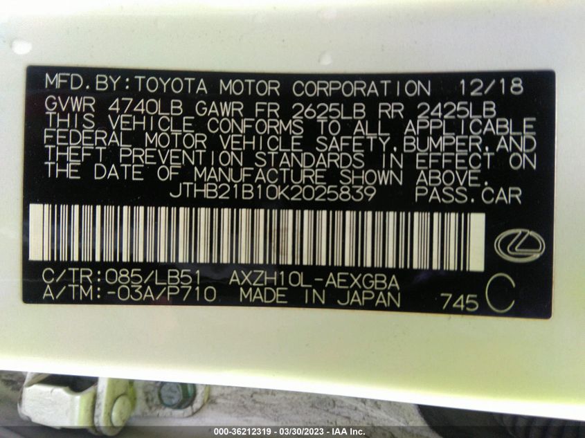 2019 Lexus ES 300h – JTHB21B10K2025839