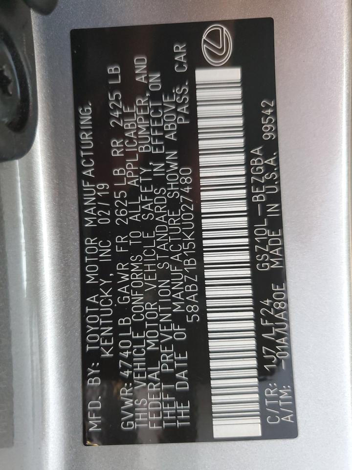 This 2019 Lexus ES 350 (Silver) comes from a major insurance auction in the USA or Canada. All information on this page is linked to the vehicle’s VIN (58ABZ1B15KU027480), which helps confirm where the car was listed and what condition it was in at the time of sale.