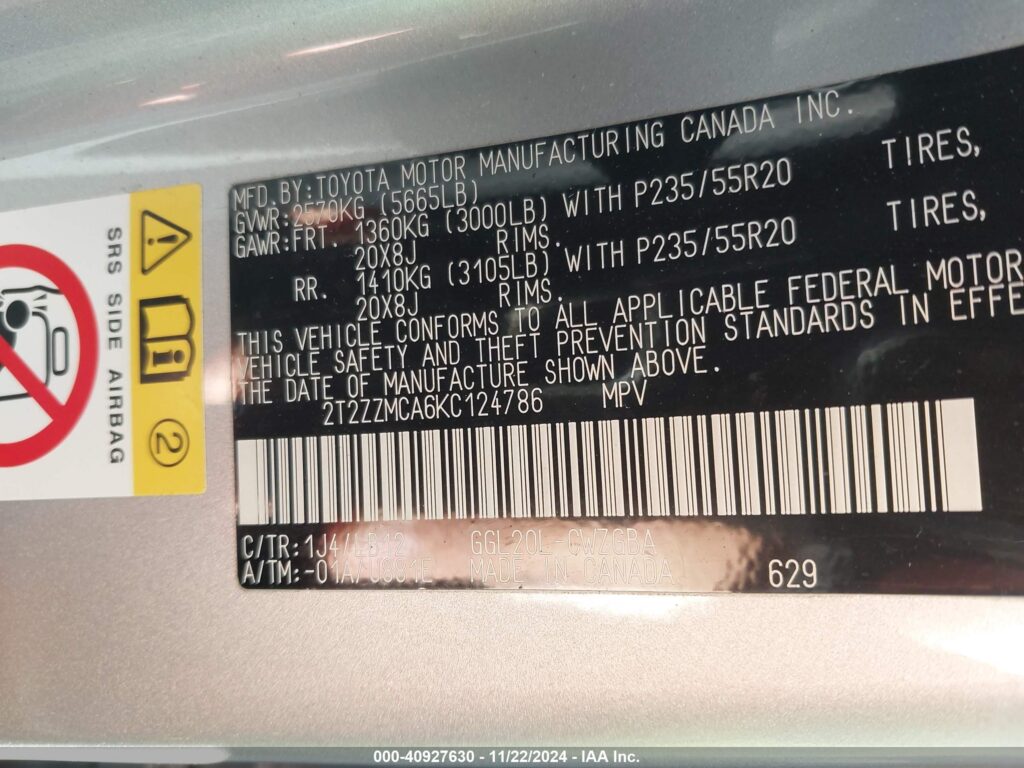 | VIN Number | 2T2ZZMCA6KC124786 |
