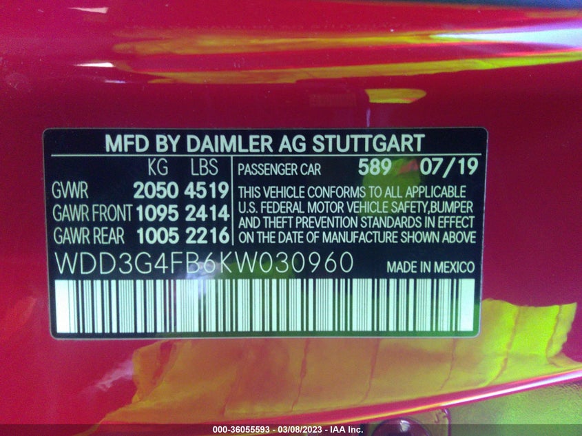 This 2019 Mercedes-Benz A-Class (Red) comes from a major insurance auction in the USA or Canada. All information on this page is linked to the vehicle’s VIN (WDD3G4FB6KW030960), which helps confirm where the car was listed and what condition it was in at the time of sale.