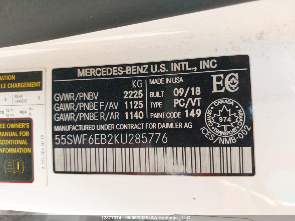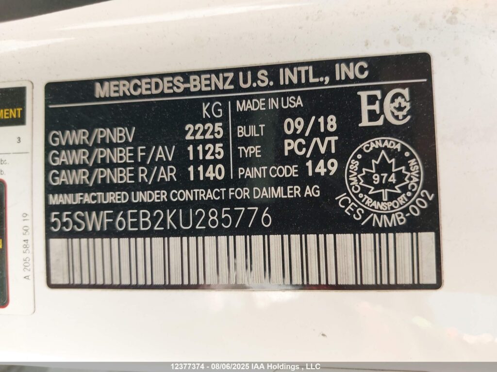 This 2019 Mercedes-benz C class (White) comes from a major insurance auction in the USA or Canada. All information on this page is linked to the vehicle’s VIN (55SWF6EB2KU285776), which helps confirm where the car was listed and what condition it was in at the time of sale.