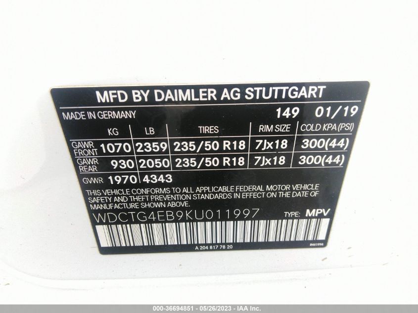 2019 Mercedes-Benz GLA-Class – WDCTG4EB9KU011997