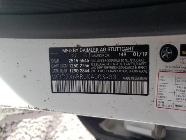 This 2019 MERCEDES-BENZ GT-CLASS (WHITE) comes from a major insurance auction in the USA or Canada. All information on this page is linked to the vehicle’s VIN (WDD7X6BB0KA003933), which helps confirm where the car was listed and what condition it was in at the time of sale.