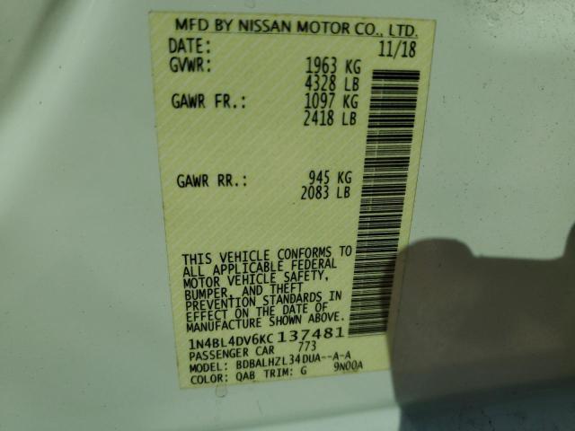 This 2019 Nissan Altima (White) comes from a major insurance auction in the USA or Canada. All information on this page is linked to the vehicle’s VIN (1N4BL4DV6KC137481), which helps confirm where the car was listed and what condition it was in at the time of sale.