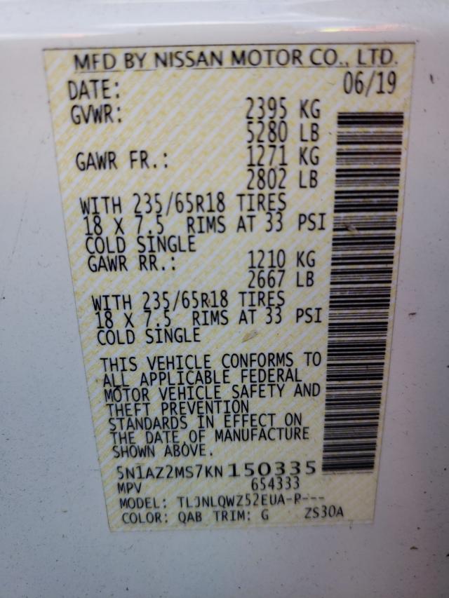 This 2019 Nissan Murano (White) comes from a major insurance auction in the USA or Canada. All information on this page is linked to the vehicle’s VIN (5N1AZ2MS7KN150335), which helps confirm where the car was listed and what condition it was in at the time of sale.