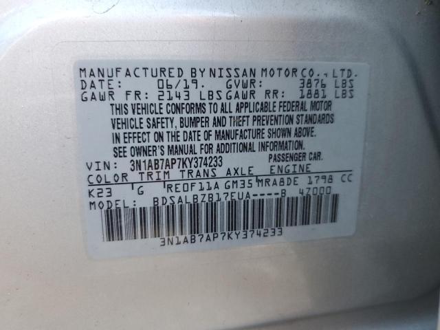 This 2019 Nissan Sentra (Silver) comes from a major insurance auction in the USA or Canada. All information on this page is linked to the vehicle’s VIN (3N1AB7AP7KY374233), which helps confirm where the car was listed and what condition it was in at the time of sale.