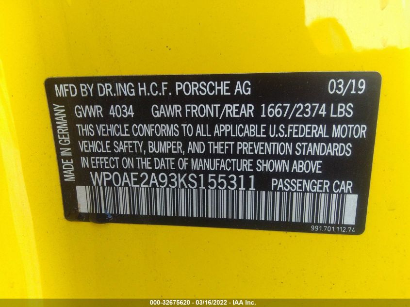 2019 PORSCHE 911 – WP0AE2A93KS155311