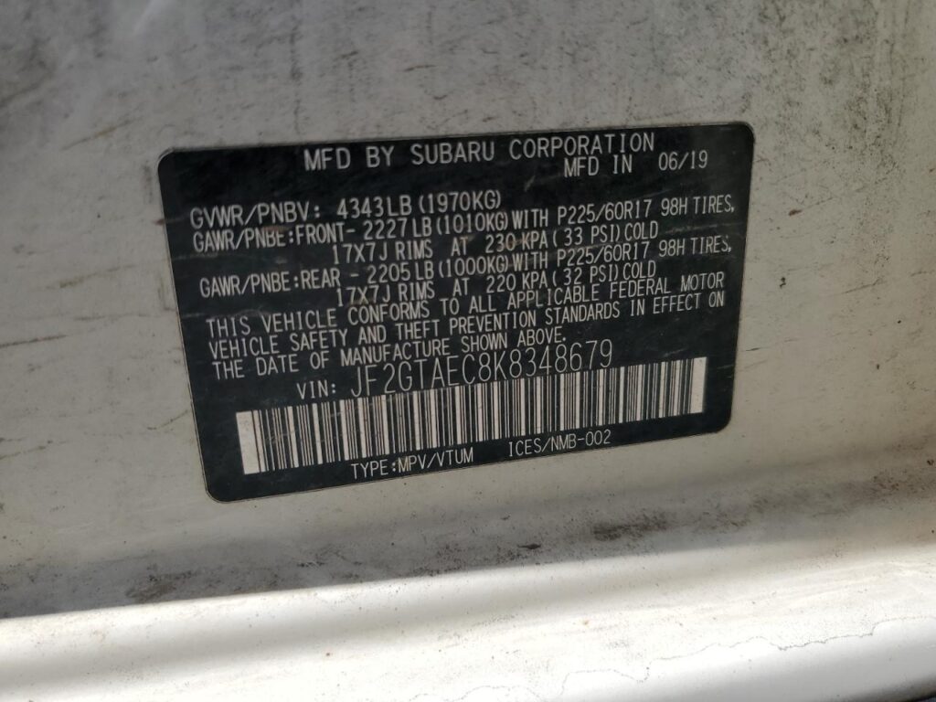 This 2019 SUBARU CROSSTREK (WHITE) comes from a major insurance auction in the USA or Canada. All information on this page is linked to the vehicle’s VIN (JF2GTAEC8K8348679), which helps confirm where the car was listed and what condition it was in at the time of sale.