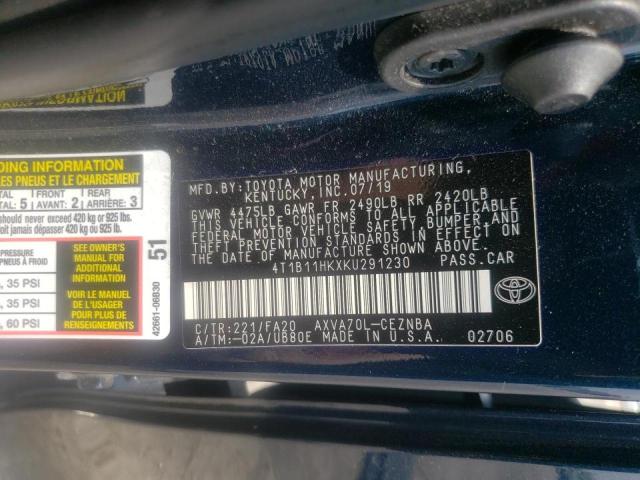 This 2019 Toyota Camry (Blue) comes from a major insurance auction in the USA or Canada. All information on this page is linked to the vehicle’s VIN (4T1B11HKXKU291230), which helps confirm where the car was listed and what condition it was in at the time of sale.