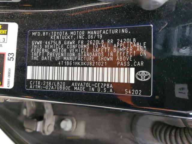 This 2019 Toyota Camry (Black) comes from a major insurance auction in the USA or Canada. All information on this page is linked to the vehicle’s VIN (4T1B61HKXKU821021), which helps confirm where the car was listed and what condition it was in at the time of sale.