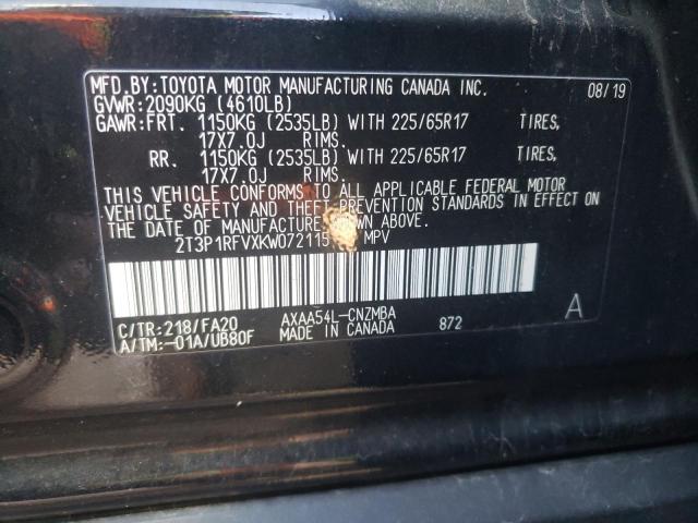 This 2019 Toyota RAV4 (Black) comes from a major insurance auction in the USA or Canada. All information on this page is linked to the vehicle’s VIN (2T3P1RFVXKW072115), which helps confirm where the car was listed and what condition it was in at the time of sale.