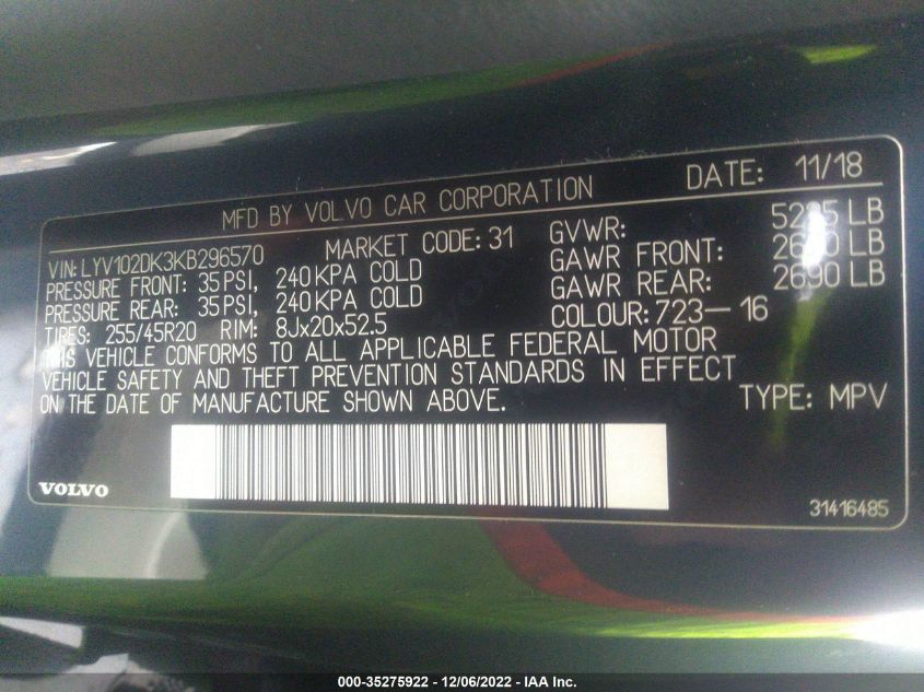 VIN: LYV102DK3KB296570