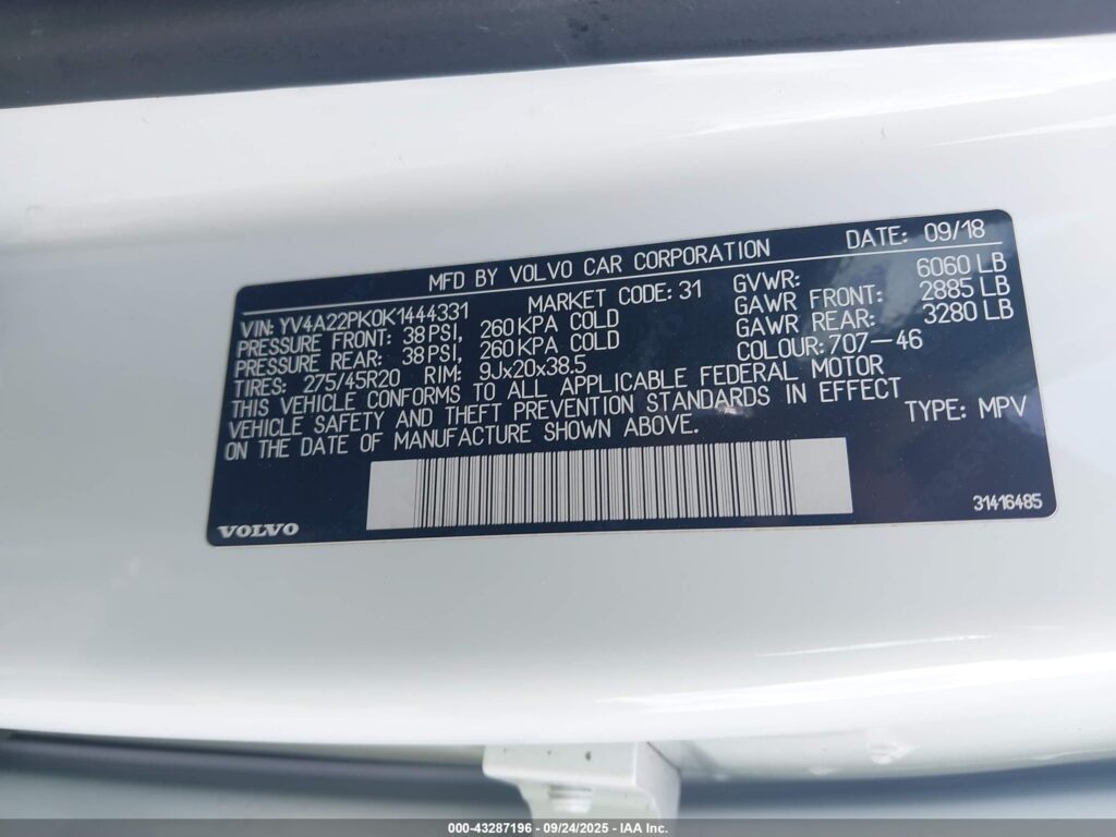 This 2019 Volvo Xc90 (White) comes from a major insurance auction in the USA or Canada. All information on this page is linked to the vehicle’s VIN (YV4A22PK0K1444331), which helps confirm where the car was listed and what condition it was in at the time of sale.
