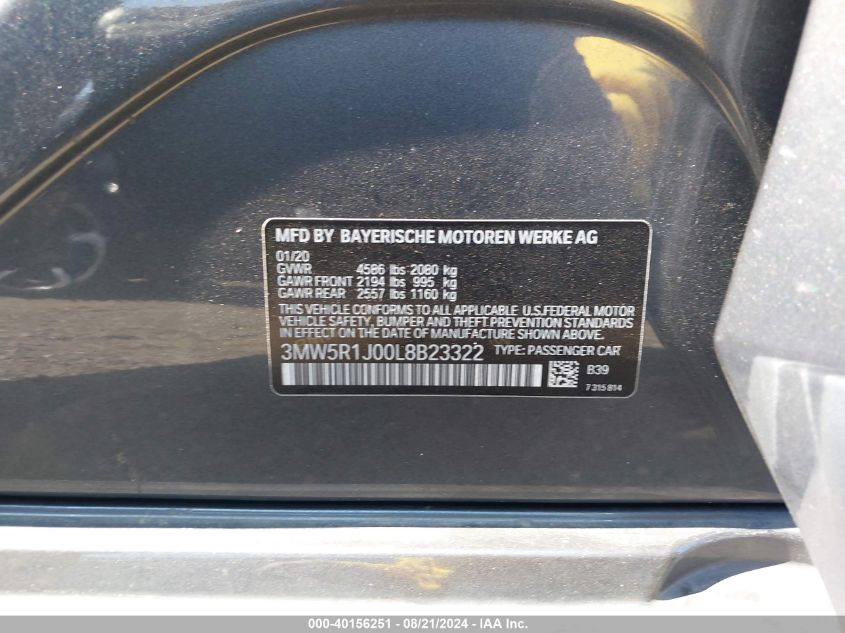 This 2020 BMW 330I (Unknown Color) comes from a major insurance auction in the USA or Canada. All information on this page is linked to the vehicle’s VIN (3MW5R1J00L8B23322), which helps confirm where the car was listed and what condition it was in at the time of sale.