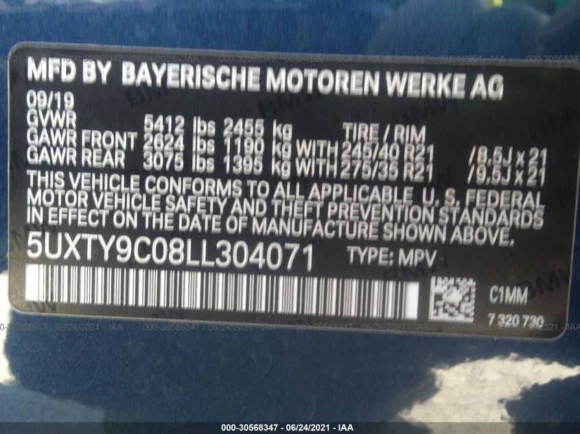 This 2020 BMW X3 (Blue) comes from a major insurance auction in the USA or Canada. All information on this page is linked to the vehicle’s VIN (5UXTY9C08LL304071), which helps confirm where the car was listed and what condition it was in at the time of sale.
