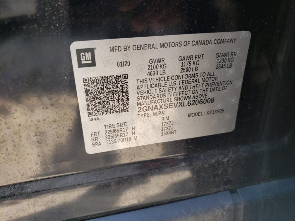 This 2020 CHEVROLET EQUINOX (BLACK) comes from a major insurance auction in the USA or Canada. All information on this page is linked to the vehicle’s VIN (2GNAXSEVXL6206008), which helps confirm where the car was listed and what condition it was in at the time of sale.