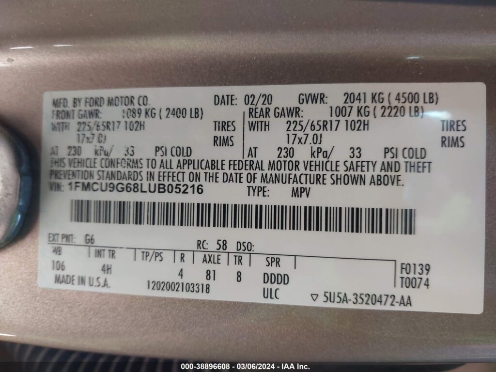 | VIN Number | 1FMCU9G68LUB05216 |